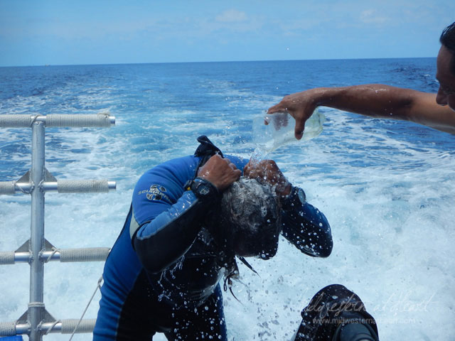 And those were our dives. On the Dive boat once you’re headed back, there is a garden hose you can rinse the salt off of you and your gear. Grady and Deb said that when Cezar came to the island 20 some years ago he was clean shaved and clean cut. Now he has his “island look” which is long hair, long beard. Well he was rinsing off with the hose and Clemente thought he’d help with some soap. Those two teased and teased each other. And finally Clemente said he’d stop with the soap and help rinse the soap out and continued to put more soap in. We laughed and laughed.