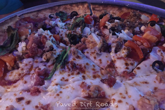 The other half of our pizza was the 10th Street Special but Mark thought it should be called everything but the kitchen sink :). Beef, Chicken, Italian Sausage, Pepperoni, Bacon, Bell Pepper, Onions, Black Olives, Tomatoes, Spinach Cauliflower, Red Sauce with a perfect cheese blend. We thought the cauliflower was an interesting addition but upon eating the pizza, YUM! It was good.