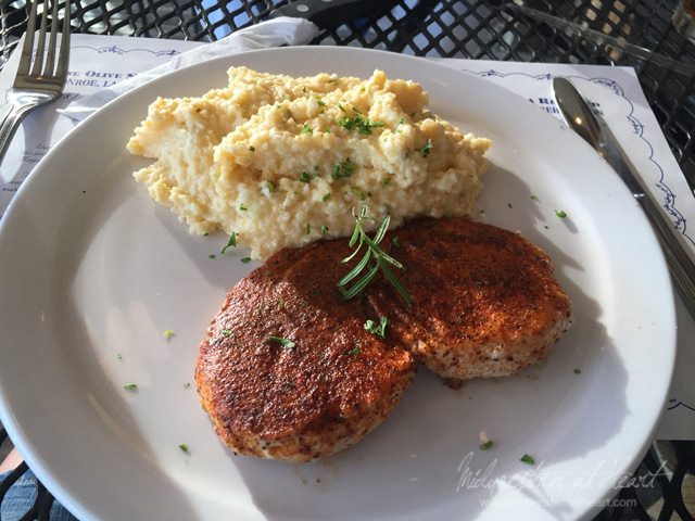 But mine was my favorite. Blackened Chicken breast and Cheddar Jalapeño Cheese Grits. That was after all the lure to bring us here. OMG, they were excellent and so worth it. Abug maybe didn’t agree, but hey, she did try a bite. That’s saying something! And that chicken breast. Oh that Chicken Breast. YUM!