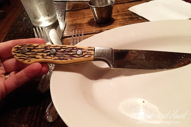 And how beautiful are these steak knives? Oh, and the steak you ask? Delicious! Omg, they know how to cook steaks! Abug was licking her lips for steak. She ate and ate steak. The kid loves steak and it better not be more than Medium for her taste. I guess I taught her right (depending on who you ask that is).