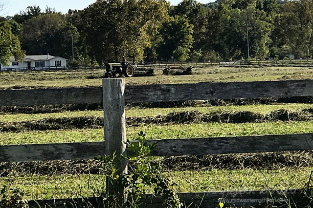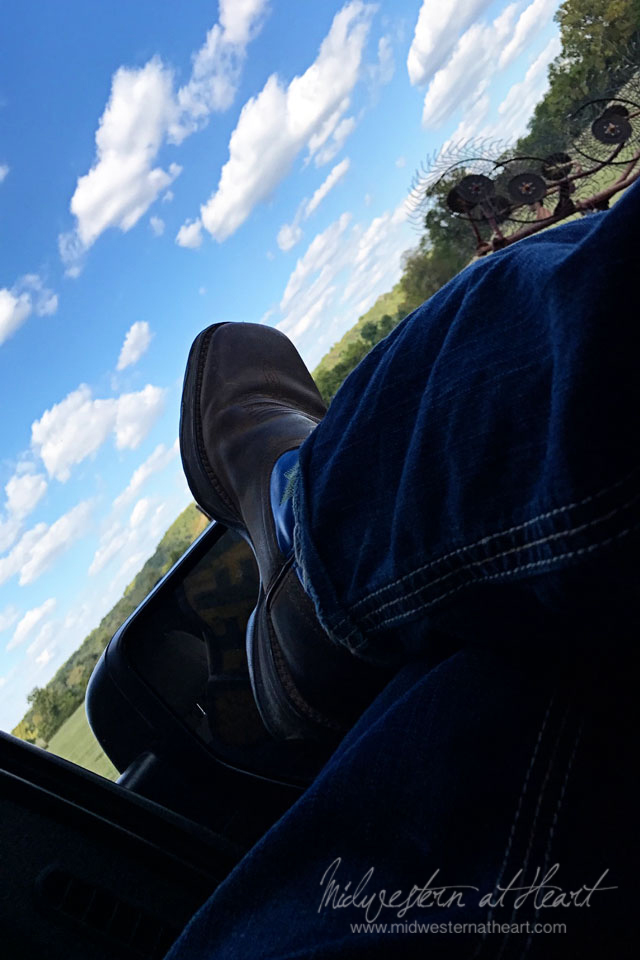 When we got there, hubby asked if he could help. Jared said just help him hook up tractors to equipment, but we weren’t about to leave him by himself, so hubby jumped on one tractor to rake while Jared jumped on the other to bale. Abug and I just hung out and entertained ourselves in the field.