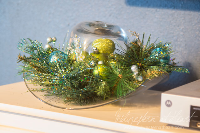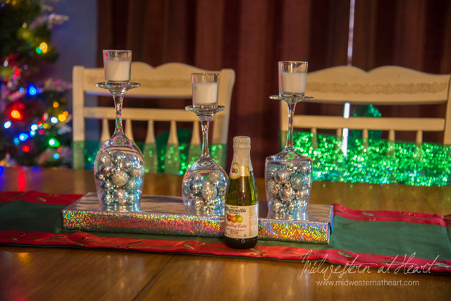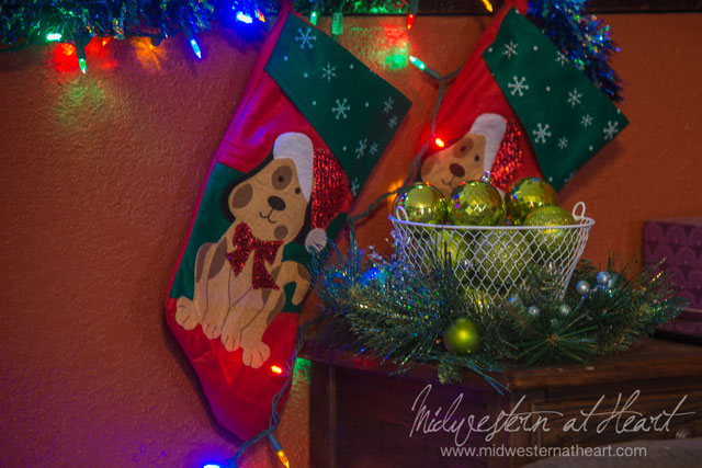 Karen likes blue and I heard Jared does too, so we went with a blue themed Christmas tree with sprinkles of silver and green just for added color. I thought it would be fun to wrap empty boxes and place Christmas lights in the boxes for added color/decoration. We went to Hobby Lobby in search of inspiration for a wreath and I absolutely adore the wreath on the front door. I went to the dollar store and bought cheap wine glasses to create a table center piece and stockings for the pooches and kitty. The stockings for J&K while a little smaller are a lot more classier. The Santa hat on the tv was taken from a drinking game (every time someone’s head looks like it’s wearing the Santa hat you drink). Lights on Karen’s indoor wreath were a last minute thought as was placing green balls in the glass cowboy hat. Hubby wanted to make sure to put lights out on the front of the house. And so, the thought became reality and bam, we decorated their house for them. We even added personalized touches to the Christmas tree in the form of a KC Santa grilling, a Boxer dog, a naughty or nice ornament, and an ornament from where they went to college.