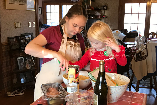 We had to leave though to go home and start working on food for that evening with my family. The girls both LOVE to help cook so they jumped in and started helping me (and each other).