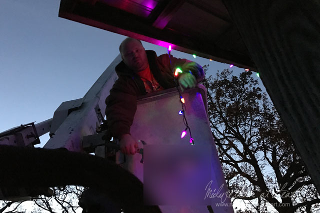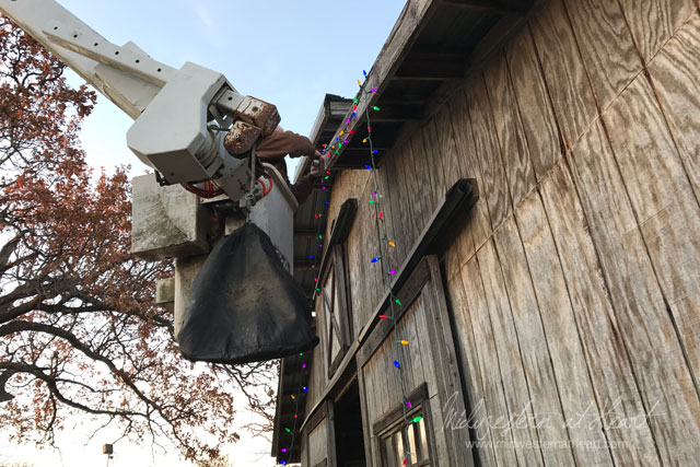 What have we been up to lately? Well decorating for Christmas. We actually had a bucket truck at our house to work on our Arena lights for my dad, so while it was there, we quickly hung lights on the front of the barn.