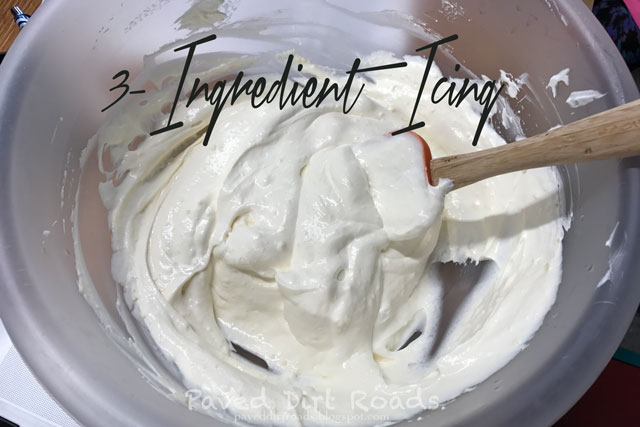 And bam, 3-ingredient icing. Then add it to your cake… or you know, eat it out of the bowl. No judgement here! And for the 9×13 cake I made yesterday, I didn’t even use all of the icing… see the skim milk sugars spread even thinner.