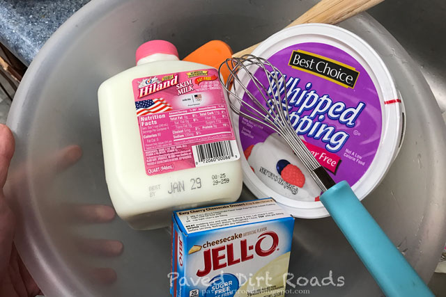 Add half the milk you’d normally add to the pudding. So the pudding calls for 2 cups, you just put 1 cup in. Then use your whisk and whisk together. When it gets thick, fold in the coolwhip.