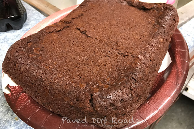 | We were being impatient waiting for the cake to cool to ice it… therefore we inverted it, on a little to small of plate, and then stuck it in the freezer. It worked and tasted even better!! |