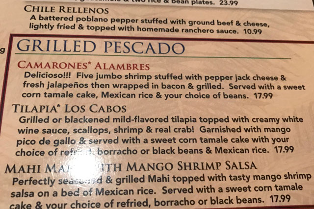 The waitress (or server for you politically correct type) told us that all the red dishes were signature dishes. I took the picture of the Camarones Alambres because here’s the thing, I like shrimp but not a lot of shrimp. I’m not a huge seafood person, but this looked absolutely AMAZING! If I had been with someone who loved shrimp, I’d have probably gotten it, that way if I didn’t care for it, I could have conned them into switching with me. Sad but true. But I wasn’t with someone who likes fish, actually, I was with someone who likes it less than I do so I stuck with chicken (see below).