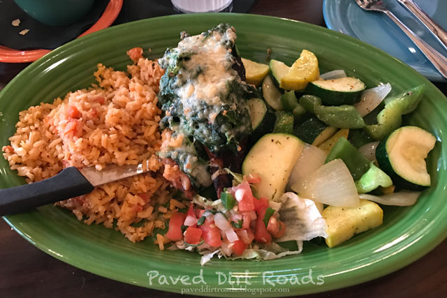 Finally, the dish I got… Roasted Garlic and Spinach Stuffed Chicken. It is a large, stuffed chicken breast topped with Cotija cheese and served with grilled vegetables & choice of refried, borracho, or black beans. Hello, if you know me I don’t like beans so I went with rice instead. The rice was good. The vegetables were better. And then that chicken. The chicken was basically flattened out and there was a layer of garlic and spinach and cheese on both pieces (or if it was flattened and folded over, then the middle and top). I might have gone a little lighter on the spinach because it was a little overpowering, but it was so good it really didn’t matter.