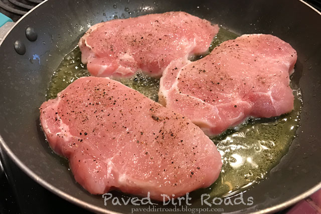 Season the pork chops with s&p. Heat the EVOO in a large skillet over high heat. When hot, add the pork chops. Brown on each side (about 2 minutes before turning), then transfer to the baking dish.