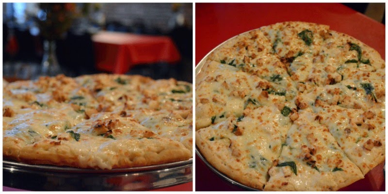 We got there before them so we ordered so that when they showed up the food would be ready. We couldn’t have timed that any better either. We got 2 orders of Fried Green Beans, one regular and one spicy (not all that spicy though!). Chicken Alfredo pizza and a Meat Lovers Pizza. Hello YUM!