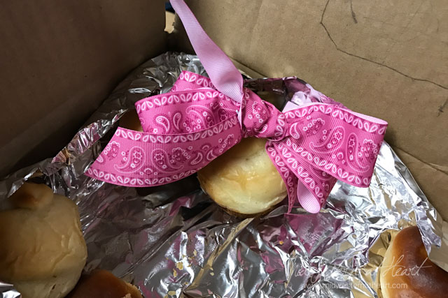 So you might be asking why a pink bow on a roll. Well at Abug’s birthday party my grandma made Resurrection Rolls. Jared and I were discussing on Wednesday the rolls I made at AC’s versus grandma’s and I said that these were better. He told me he needed to try one just to be sure. I told him I’d bring him one with a pink bow. Why a pink bow I have no clue but by golly, he got his roll with the pink bow.