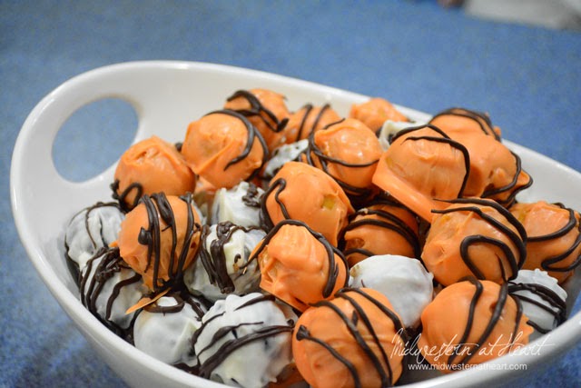 Let the balls completely cool and drizzle on top. I accidentally ran out of almond bark and so I had to use my candy melts to help finish up. I tried drizzling with a fork, it didn’t work really well… mainly glops.