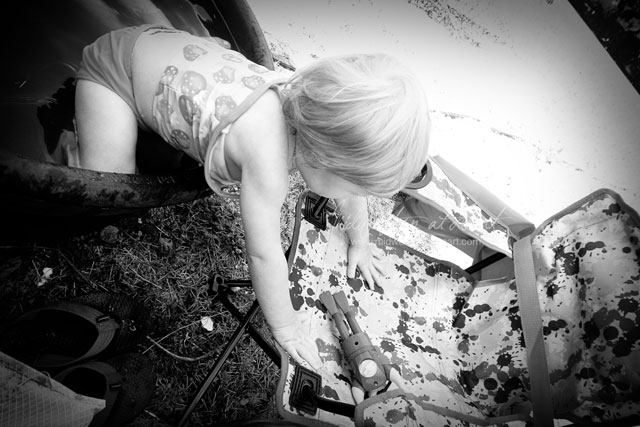 I figured that Abug would LOVE to play outside so I went and got a horse watering trough that we actually used for sheep and filled it with water for Tbug and Abug to play in. It really was the perfect size pool for Abug. She can stand up and sit down and stand up and sit down and so on… you get the point. I got Tbug a chair and said either A) sit in the chair and stick your feet in or B) get in and play with her.