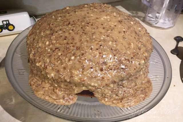 Then we were off to the house to start working on prep stuff and anything we could do the night before, like finishing desserts as well as making homemade rolls. Tbug worked on dinner for us. I worked on the rolls. They tasted good, but boy were they dense. I messed up grandma’s “recipe”. Hubby and Tbug worked on one cake, I finished up another. Mom saw on the Today show to do the lattice work for our Bacon Wrapped Turkey on parchment paper and place in the freezer 15 minutes before putting it on the turkey, so Wednesday night he did the lattice work and put it in the fridge over night so the next day all we had to do was place it in the freezer. Then it was off to bed, off to bed, off to bed.